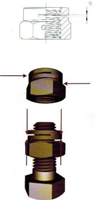 開槽鎖緊螺母的鎖緊槽經精密加工而成,使內螺紋產生一定的螺距差。當螺栓旋入時,內螺紋回復原有螺距,發生彈性形變產生的彈性力將內外螺紋緊密嚙合,使螺母牢固的自鎖在螺栓上有一種對稱開槽的設計,可使鎖緊力均衡分布在紋上,使嚙齒更緊密,適合于震動更劇烈的應用.